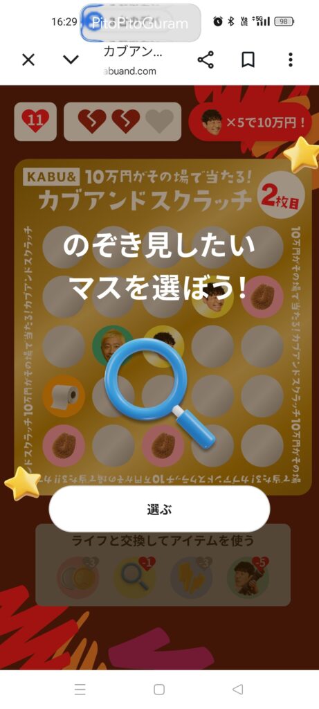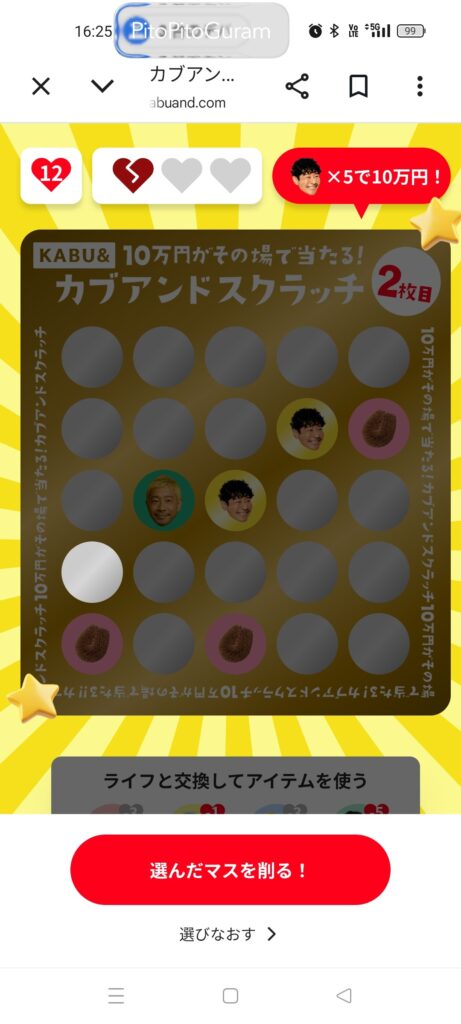 当たり3個目を目指し、次は「左から1番目、下から2番目」を直感で選ぶも、「はずれ」。