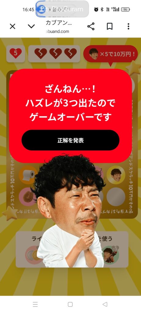 最後も自分の直感に従って「右から2番目、下から2番目」を引きましたが、結果は「はずれ」でした。