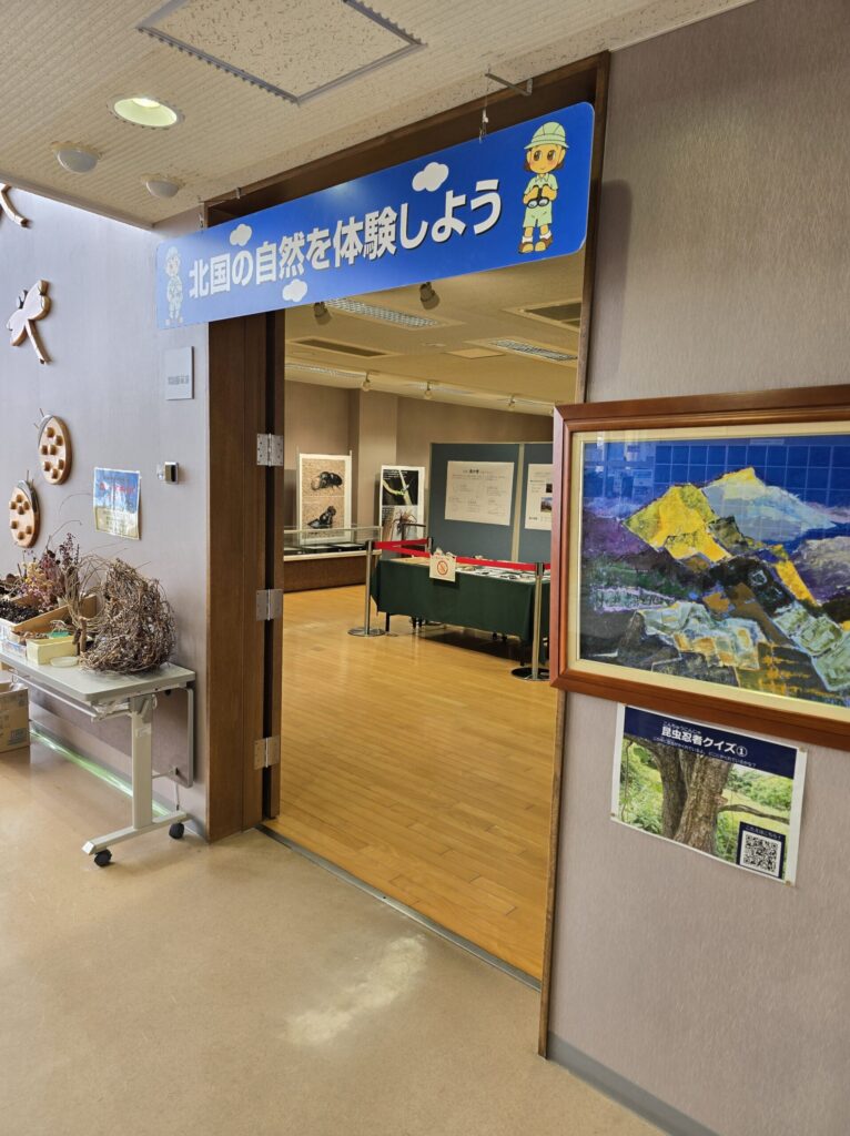 館内には、北海道に棲む野鳥や小動物のはく製、さらには世界中の美しい蝶やカブトムシの標本が並びます。