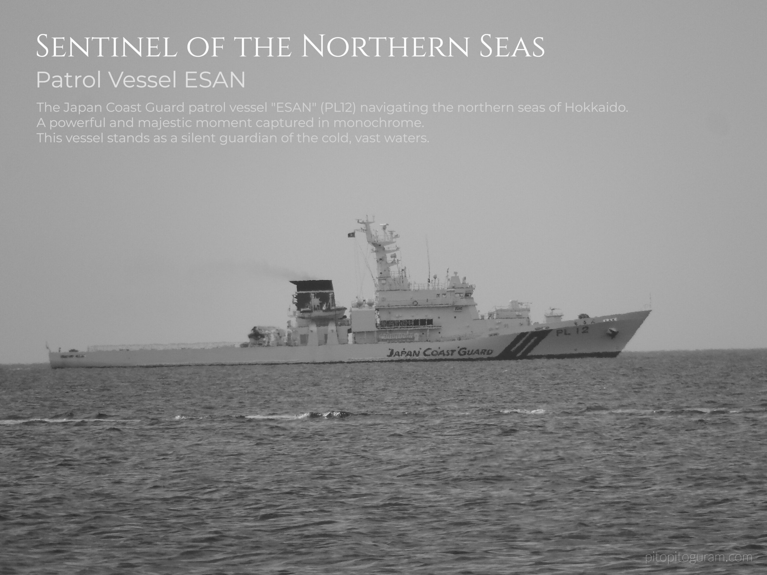 I chose to capture this moment in monochrome to emphasize the raw, metallic texture of the ship and the stark contrast of its “JAPAN COAST GUARD” markings against the grey sea. ⚓️